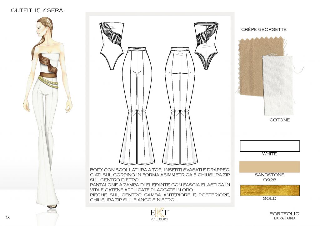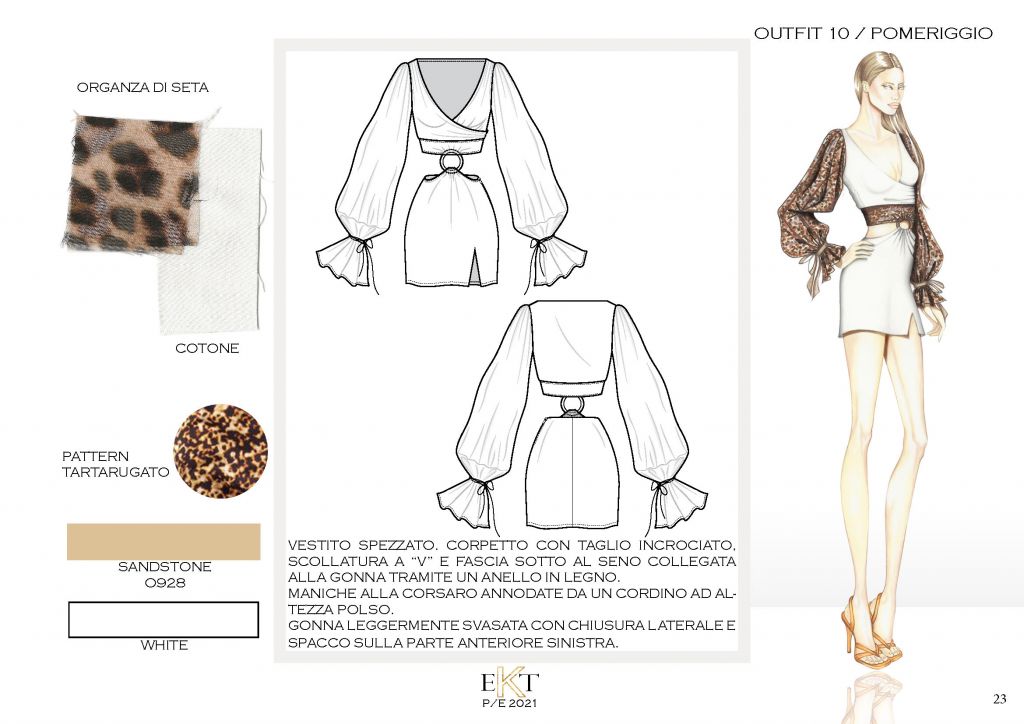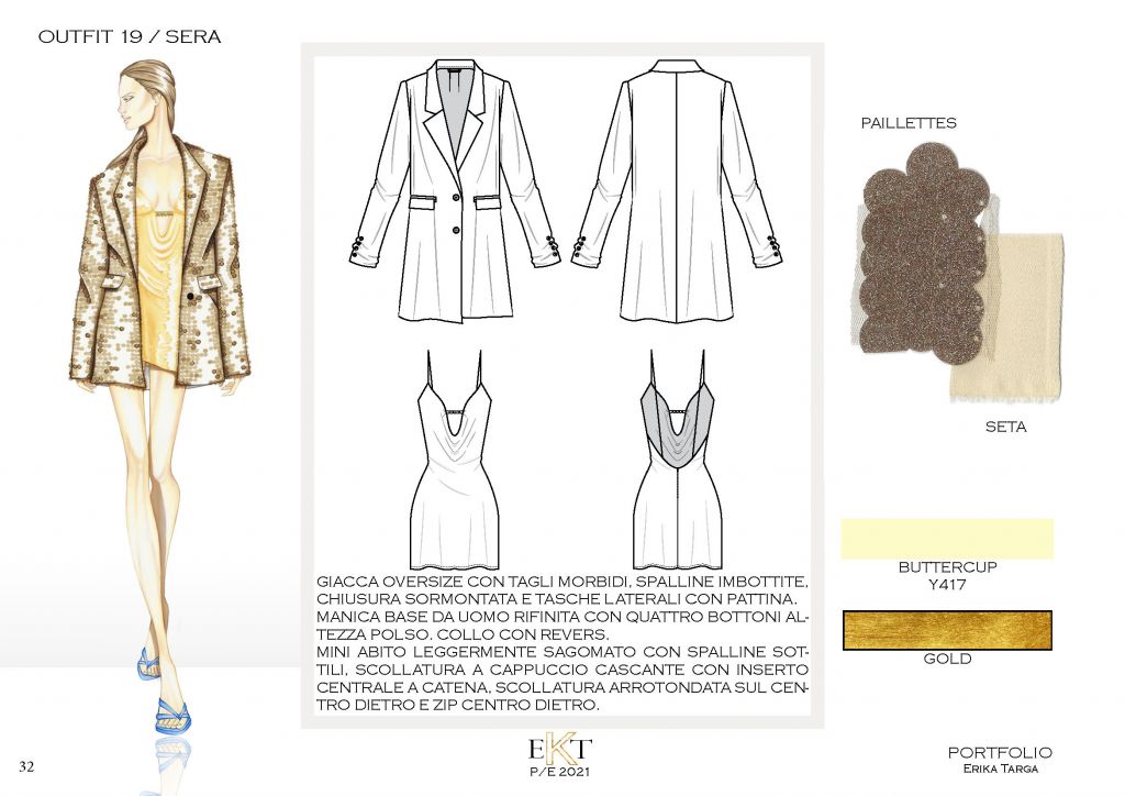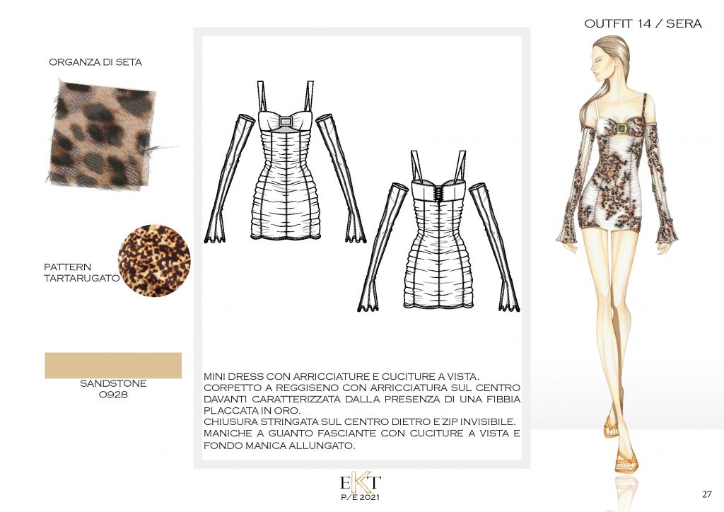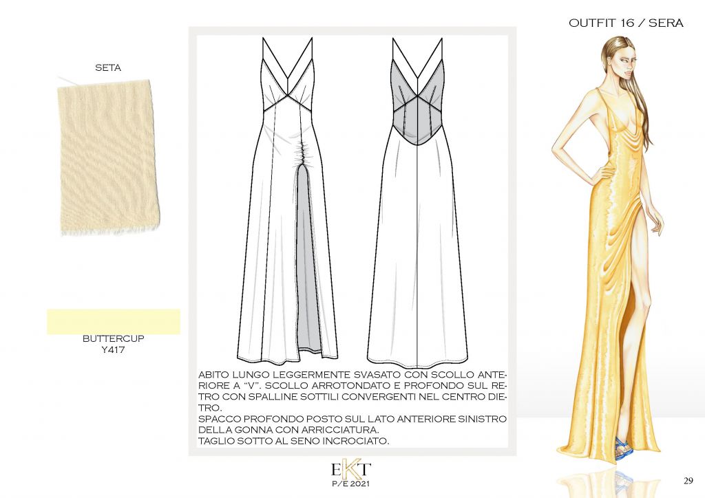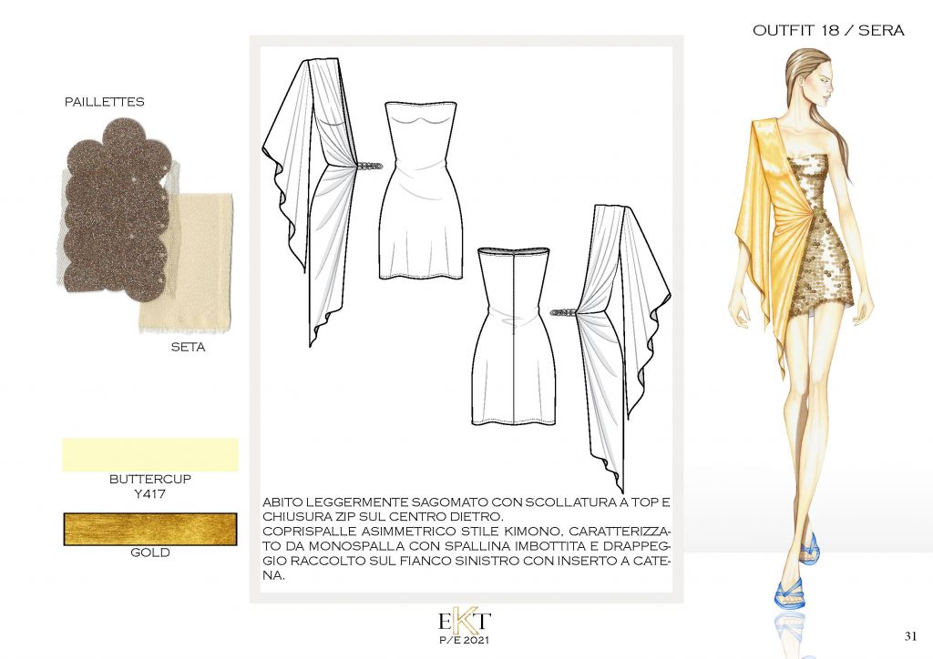 I tessuti che compongono la collezione danno vita ad una linea eclettica, spaziando tra una silhouette ariosa, data da una gonna in chiffon, ed una strutturata, resa, invece, da una giacca con le spalline imbottite, ma capace, al contempo, con un abito da sera in seta che scivola sulla sua figura, definendola, di risaltare anche la femminilità e l’eleganza.