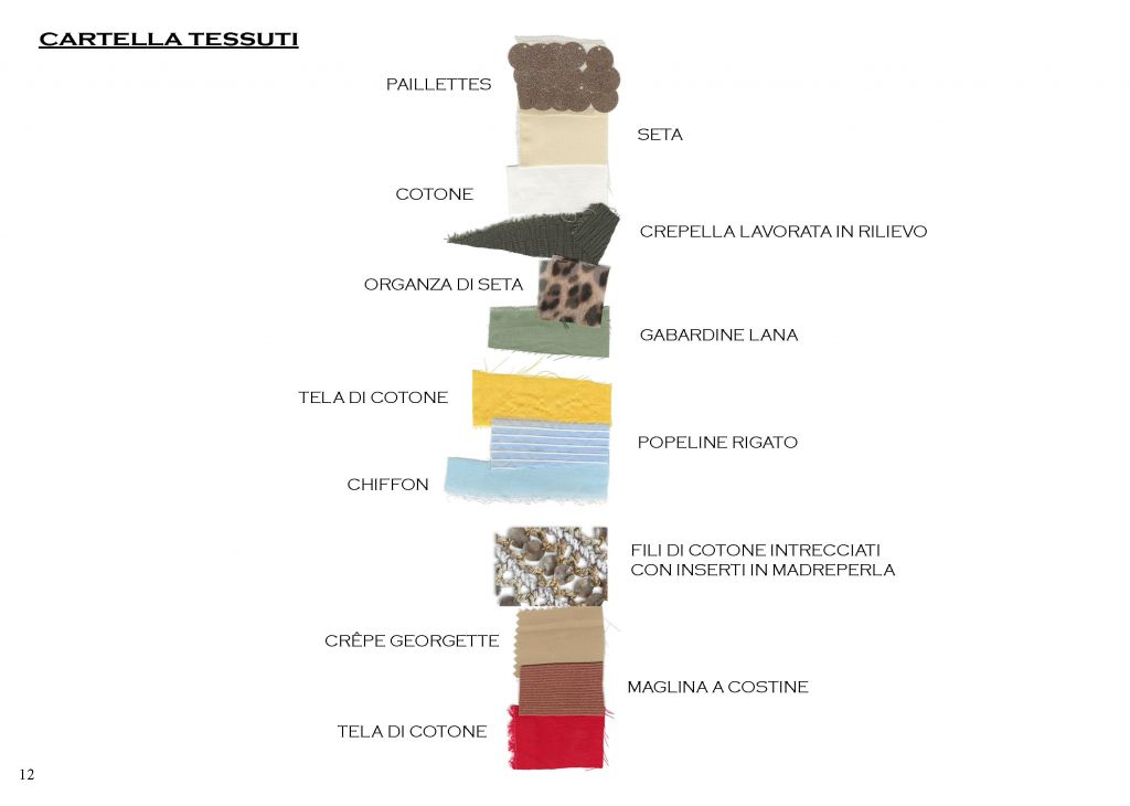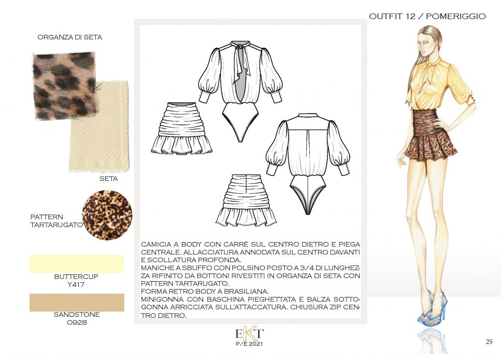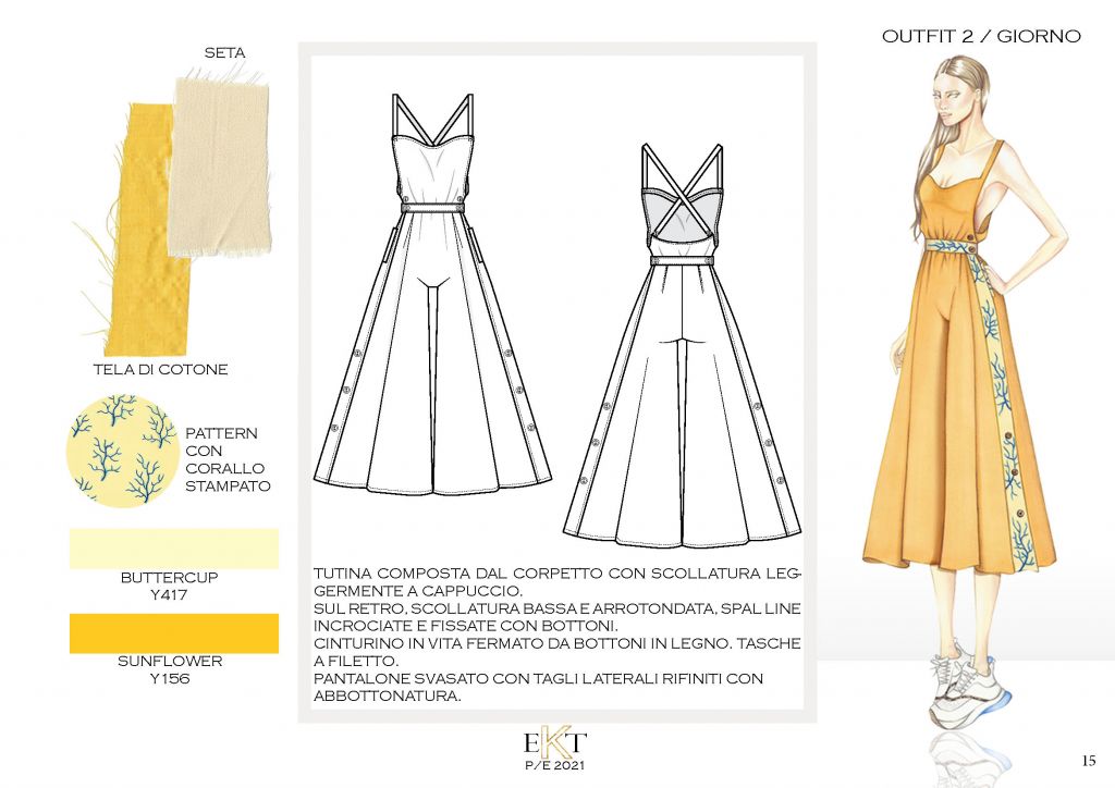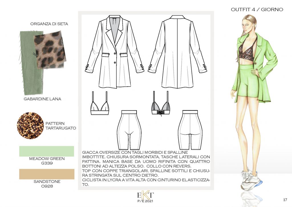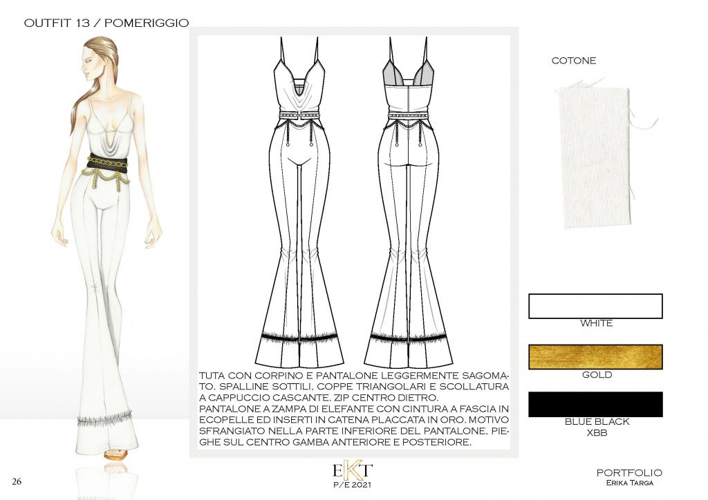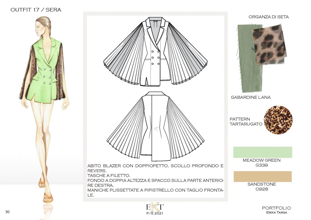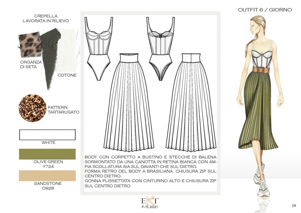 I tessuti che compongono la collezione danno vita ad una linea eclettica, spaziando tra una silhouette ariosa, data da una gonna in chiffon, ed una strutturata, resa, invece, da una giacca con le spalline imbottite, ma capace, al contempo, con un abito da sera in seta che scivola sulla sua figura, definendola, di risaltare anche la femminilità e l’eleganza.