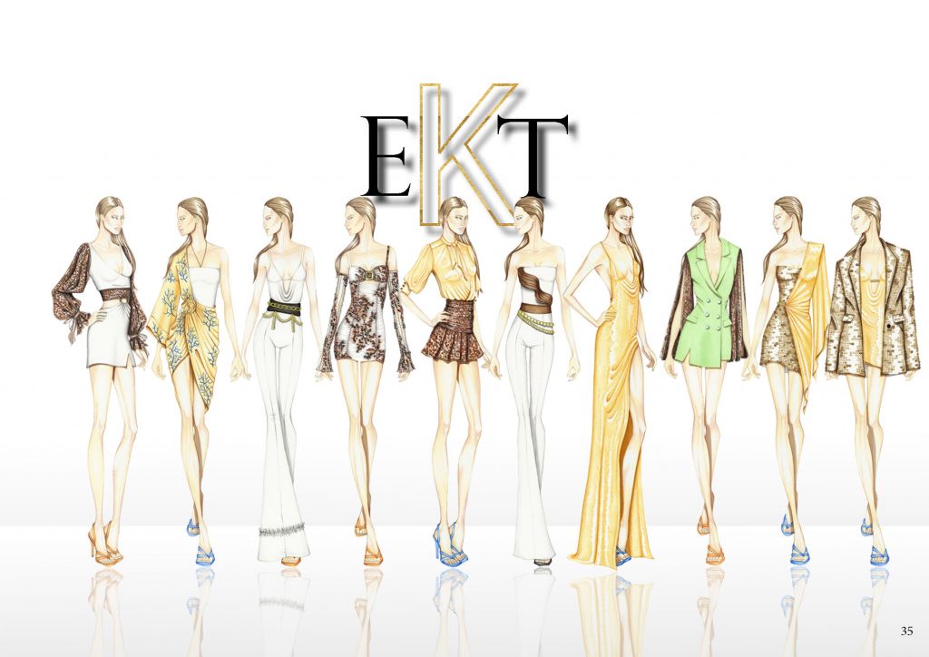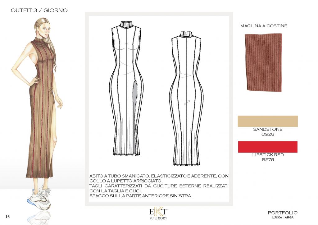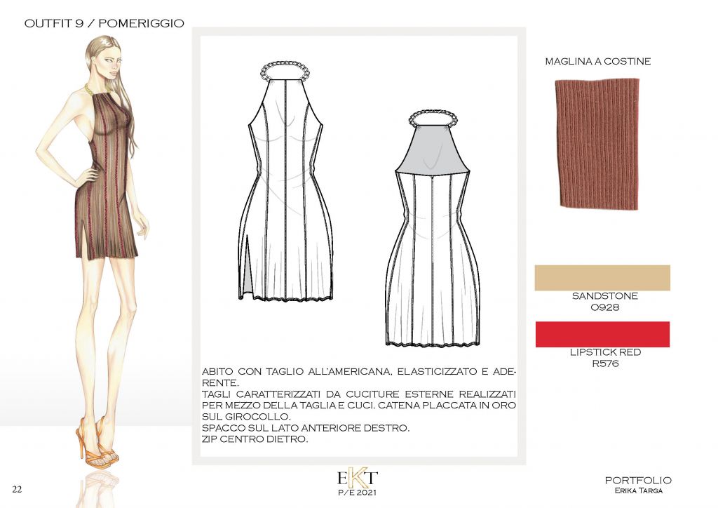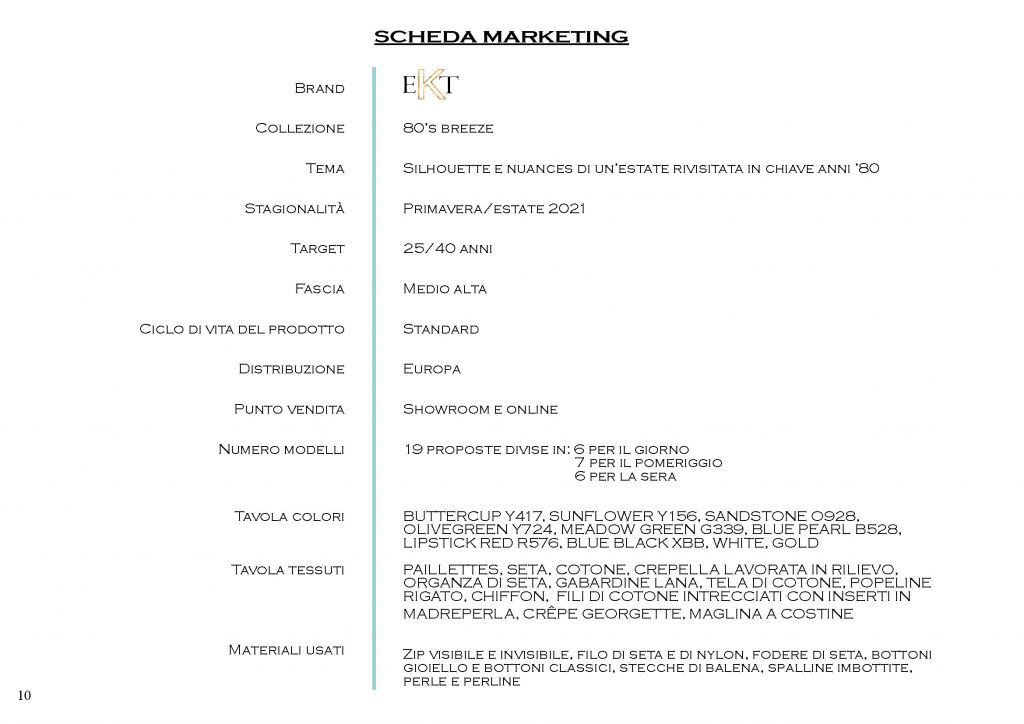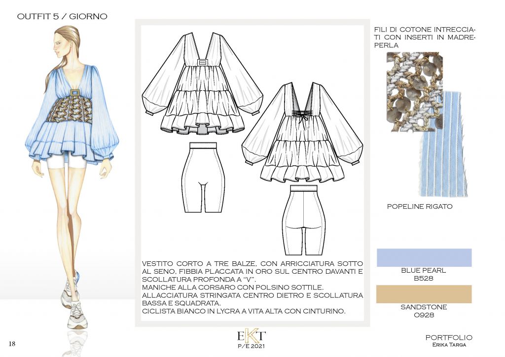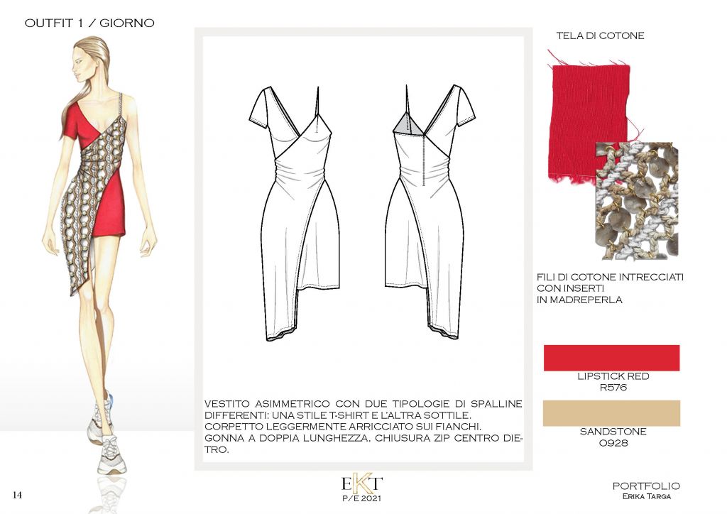 I tessuti che compongono la collezione danno vita ad una linea eclettica, spaziando tra una silhouette ariosa, data da una gonna in chiffon, ed una strutturata, resa, invece, da una giacca con le spalline imbottite, ma capace, al contempo, con un abito da sera in seta che scivola sulla sua figura, definendola, di risaltare anche la femminilità e l’eleganza.