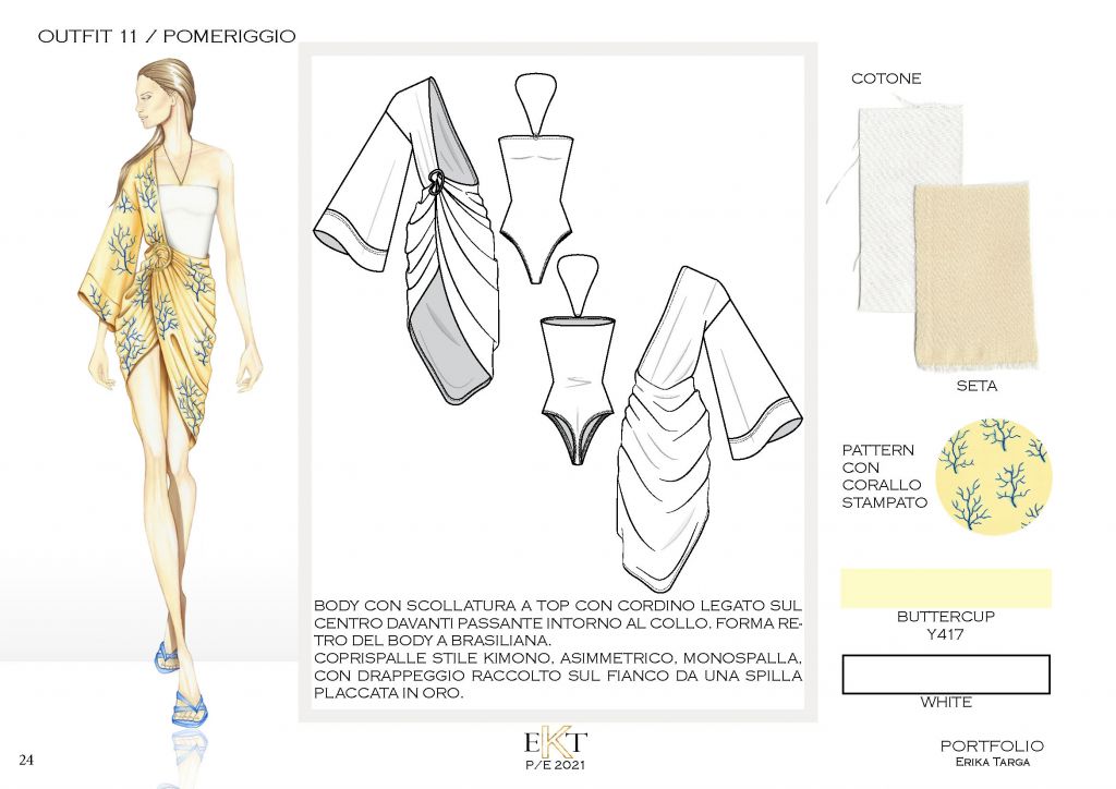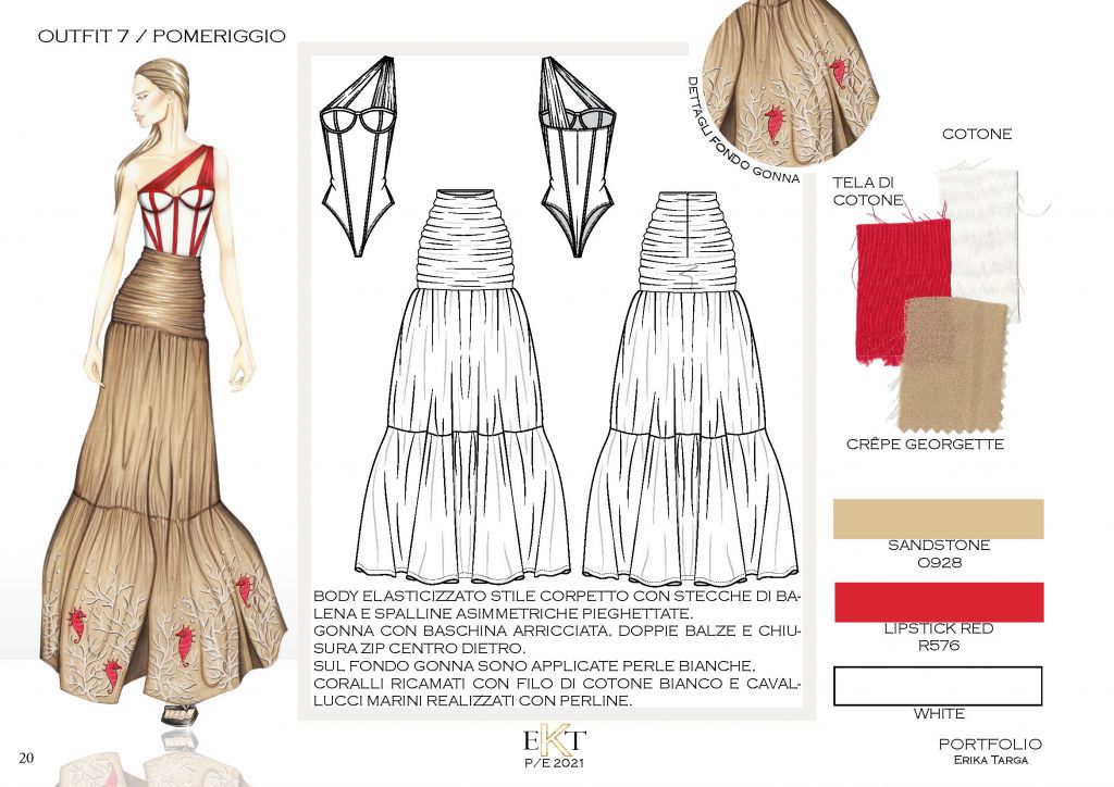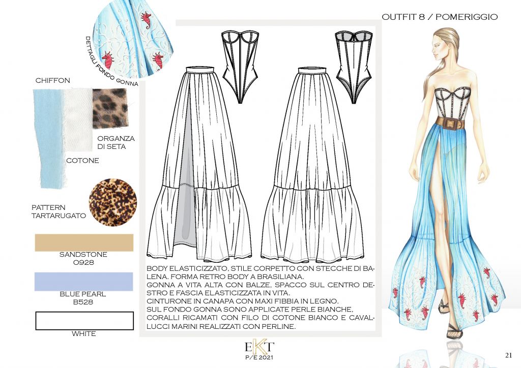 Facendo un tuffo nel passato, ho disegnato alcuni capi must della moda anni ‘80, rendendoli più attuali, freschi e spumeggianti ed incorporando nello stile elementi marini come il corallo, i cavallucci marini, le perle ed, infine, il pattern tartarugato che – tradizionalmente utilizzato per gli accessori – è, invece, qui stampato su organza di seta.