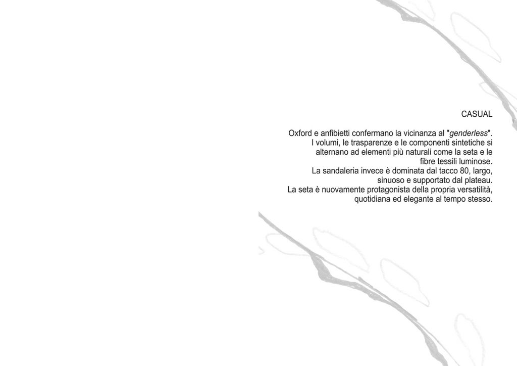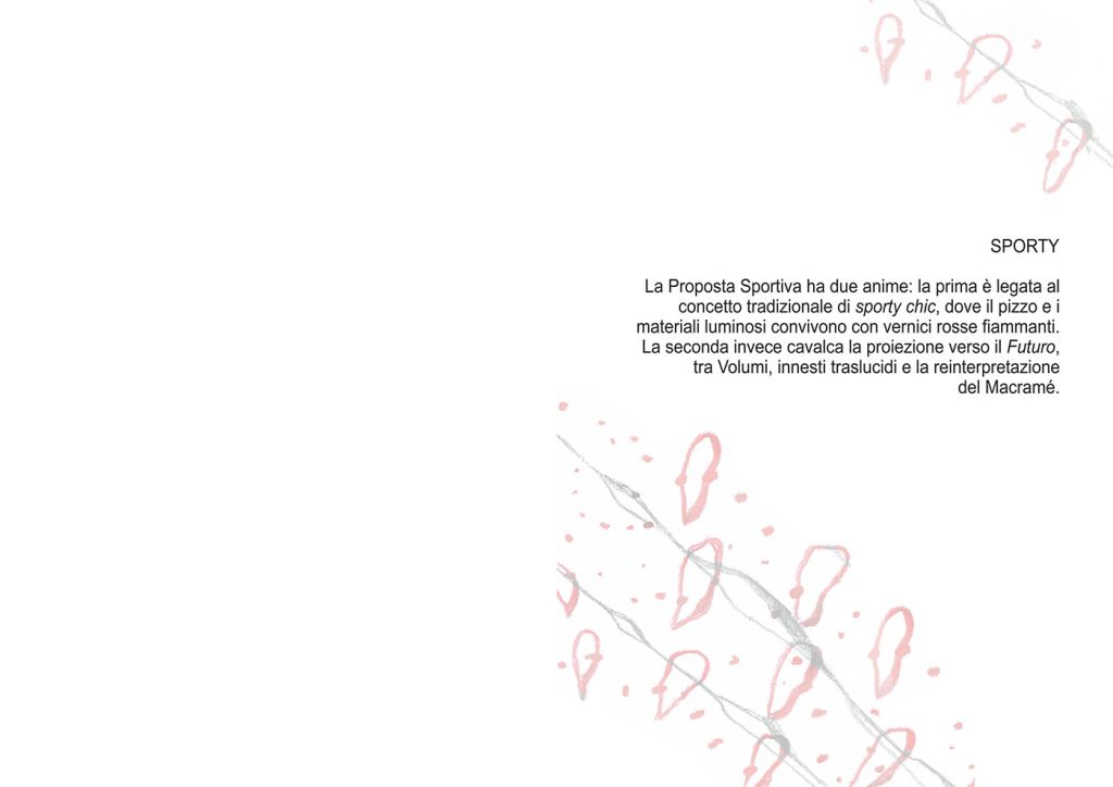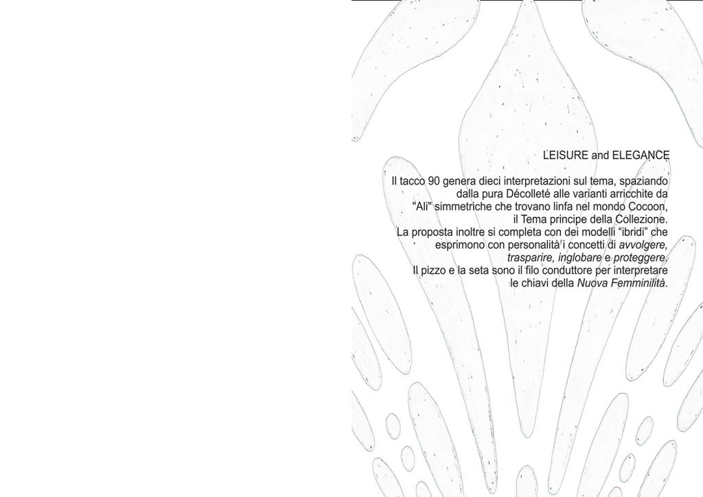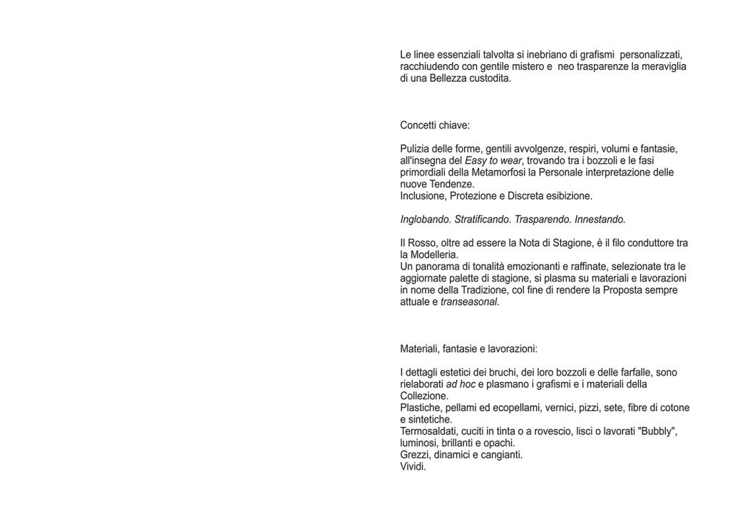 Concetti chiave: Pulizia delle forme, gentili avvolgenze, repiri, volumi e fantasie, all’insegna dell’Easy to wear, trovando tra i bozzoli e le fasi primordiali della Metamorfosi la Personale interpretazione delle nuove tendenze. Inclusione, Protezione e Discreta Esibizione. Inglobando. Stratificando. Trasparendo. Innestando.