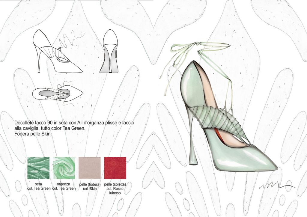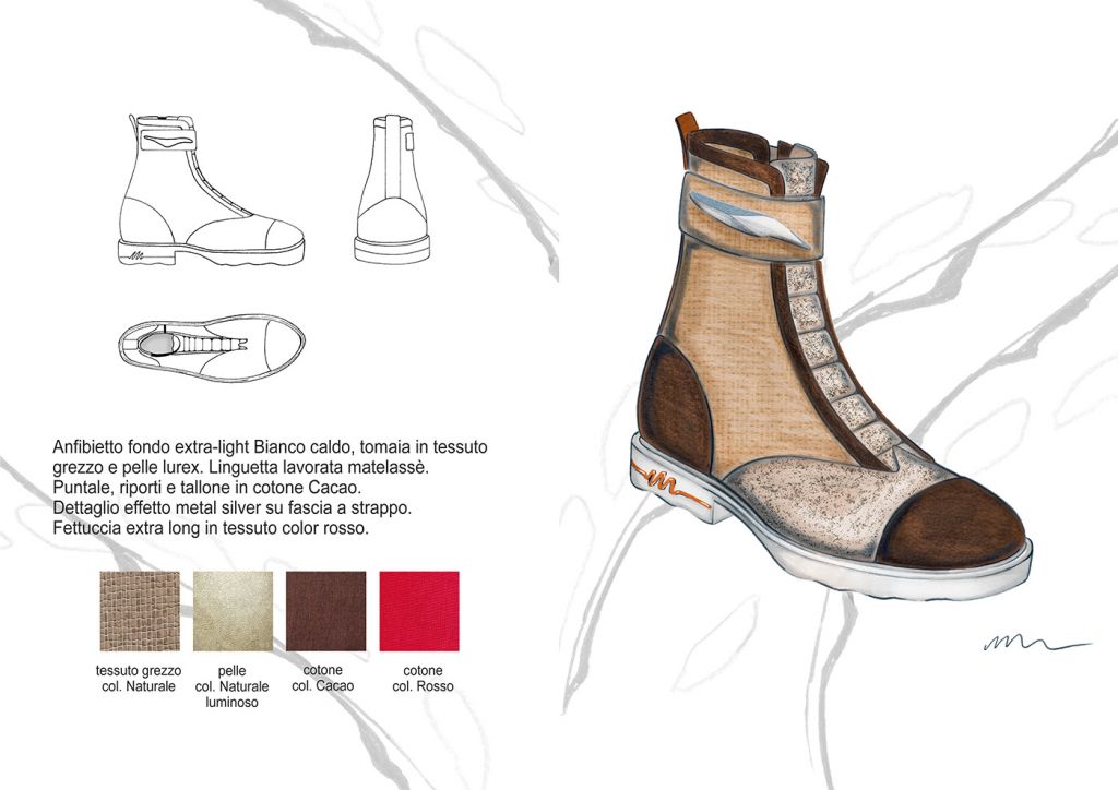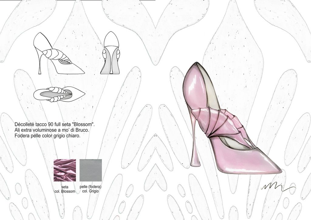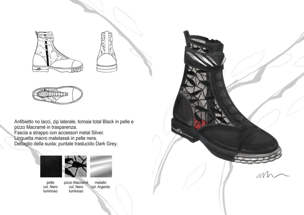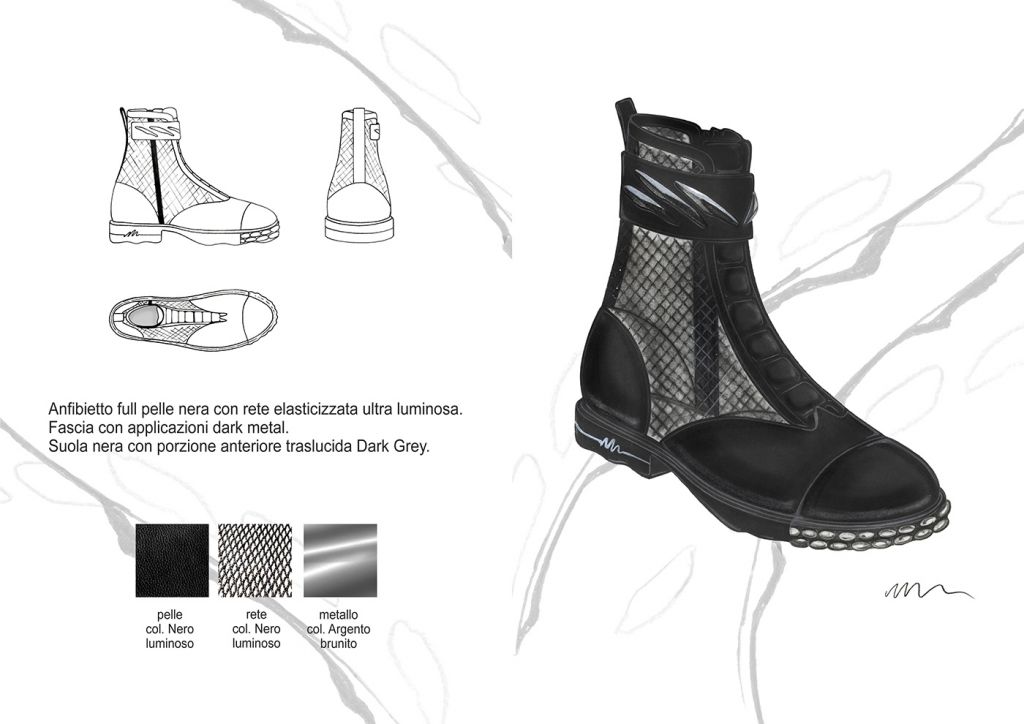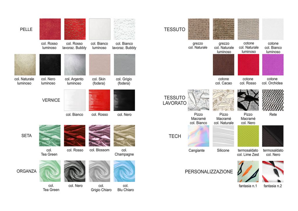 Materiali, fantasie e lavorazioni: I dettagli estetici dei bruchi, dei loro bozzoli e delle farfalle, sono rielaborati ad hoc e plasmano i grafismi e i materiali della Collezione. Plastiche , pellami ed ecopellami, vernici, pizzi, sete, fibre di cotone e sintetiche. Termosaldati cuciti in tinta o a rovescio, liscio o lavorati “Bubbly”, luminosi, brillanti e opachi. Grezzi, dinamici e cangianti. Vividi.