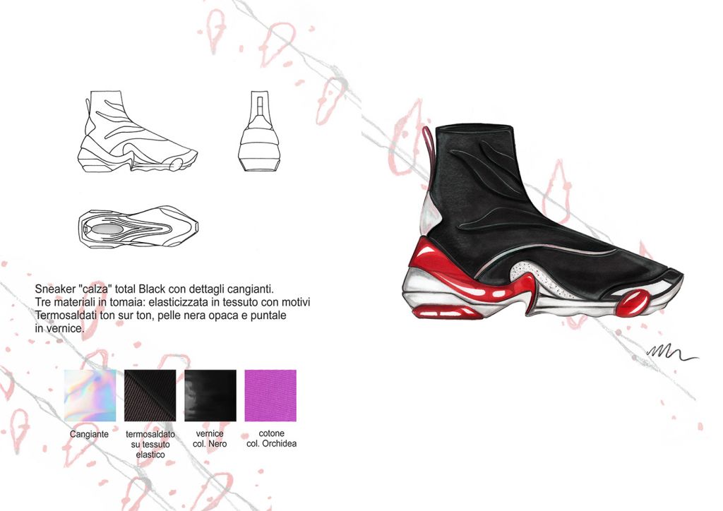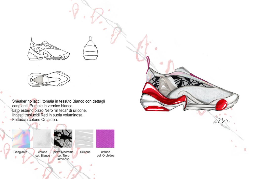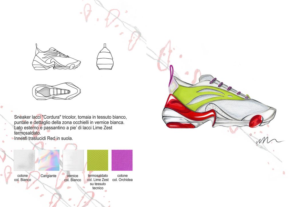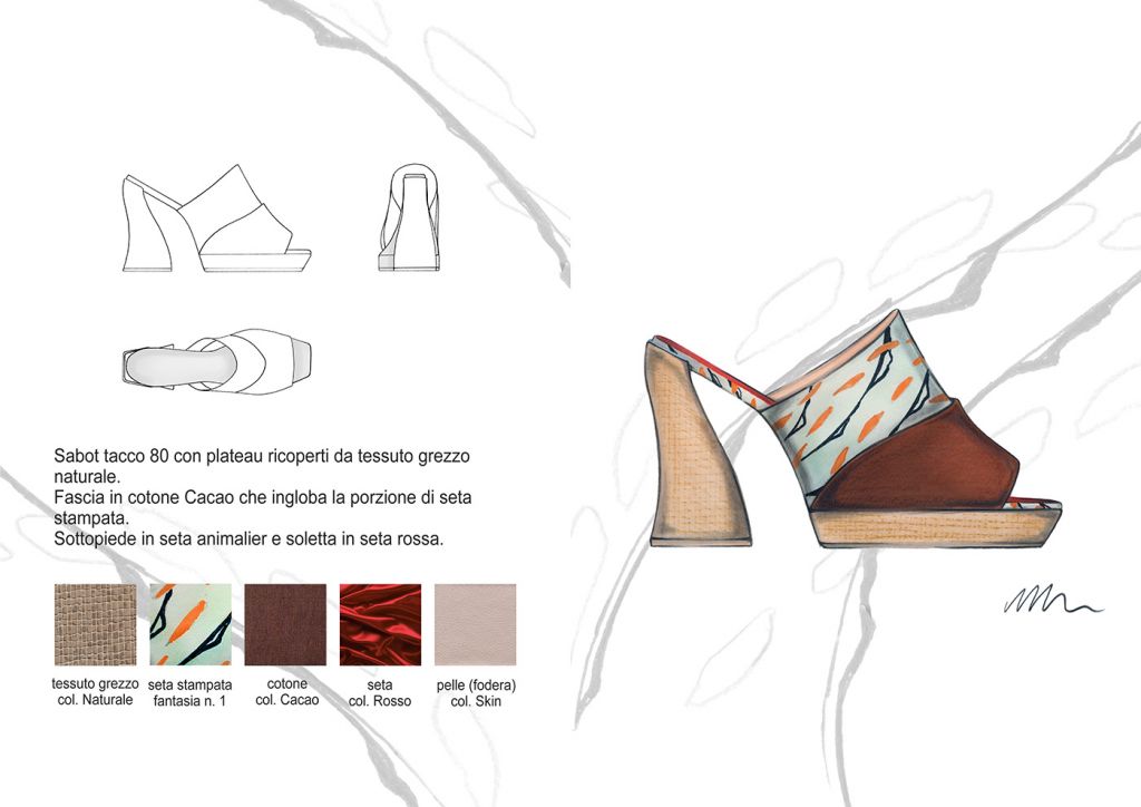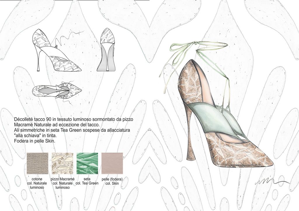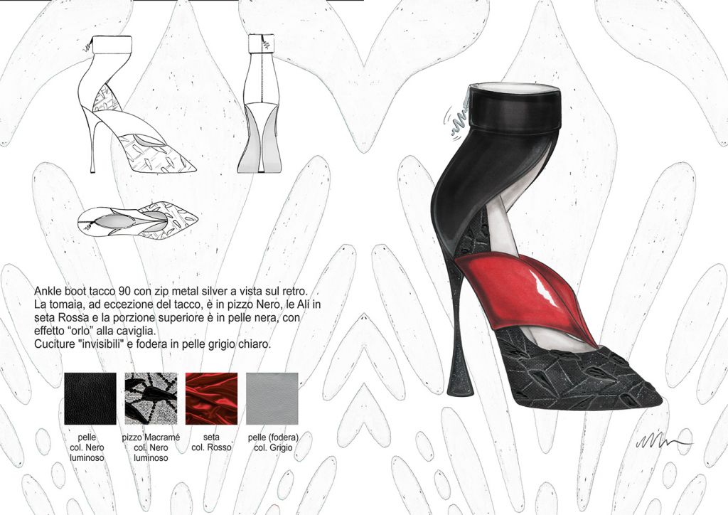 Materiali, fantasie e lavorazioni: I dettagli estetici dei bruchi, dei loro bozzoli e delle farfalle, sono rielaborati ad hoc e plasmano i grafismi e i materiali della Collezione. Plastiche , pellami ed ecopellami, vernici, pizzi, sete, fibre di cotone e sintetiche. Termosaldati cuciti in tinta o a rovescio, liscio o lavorati “Bubbly”, luminosi, brillanti e opachi. Grezzi, dinamici e cangianti. Vividi.