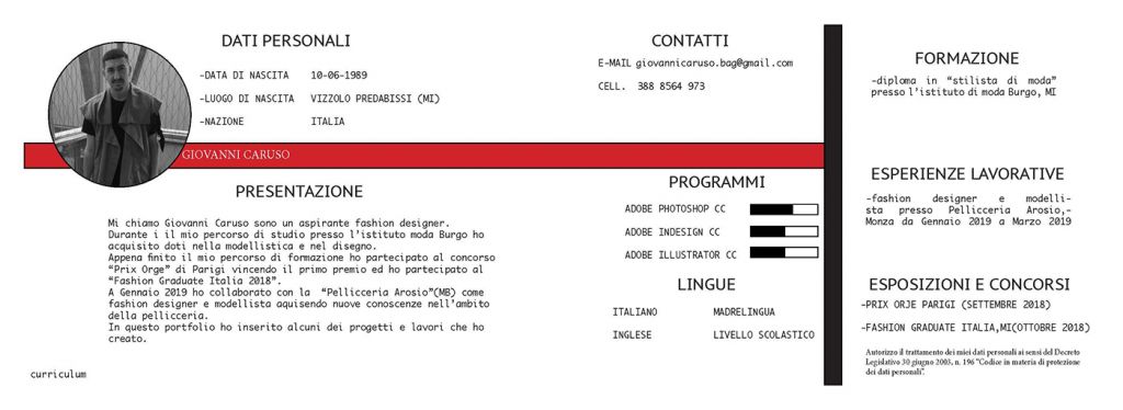 Mi chiamo Giovanni Caruso sono un aspirante fashion designer. Durante i il mio percorso di studio presso l’istituto moda Burgo ho acquisito doti nella modellistica e nel disegno. Appena finito il mio percorso di formazione ho partecipato al concorso “Prix Orge” di Parigi vincendo il primo premio ed ho partecipato al “Fashion Graduate Italia 2018”.