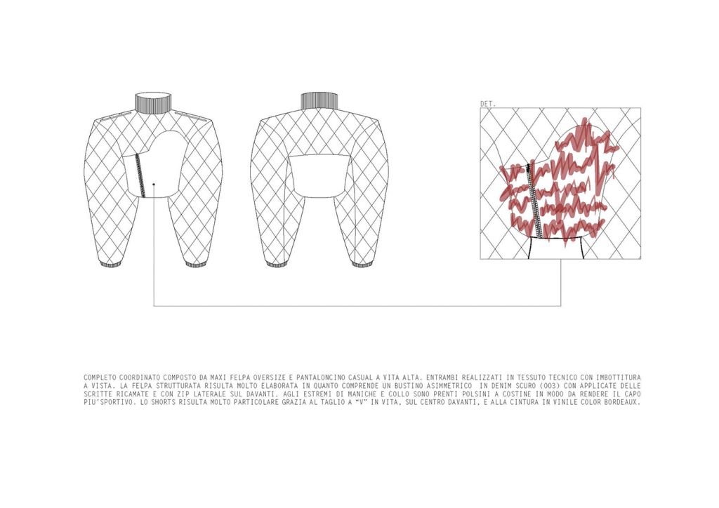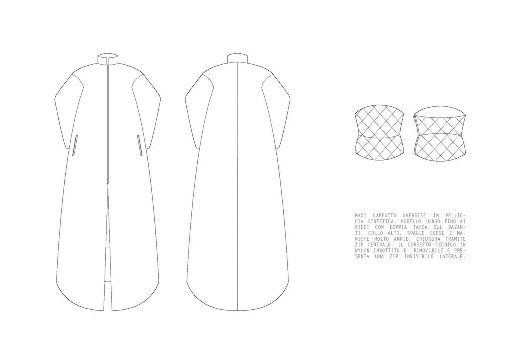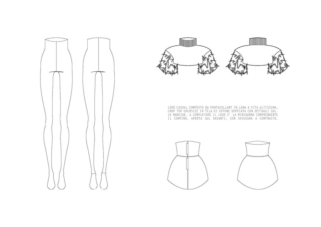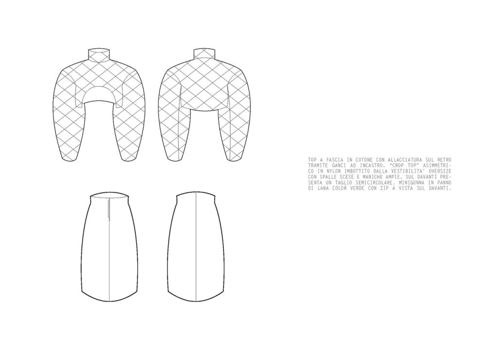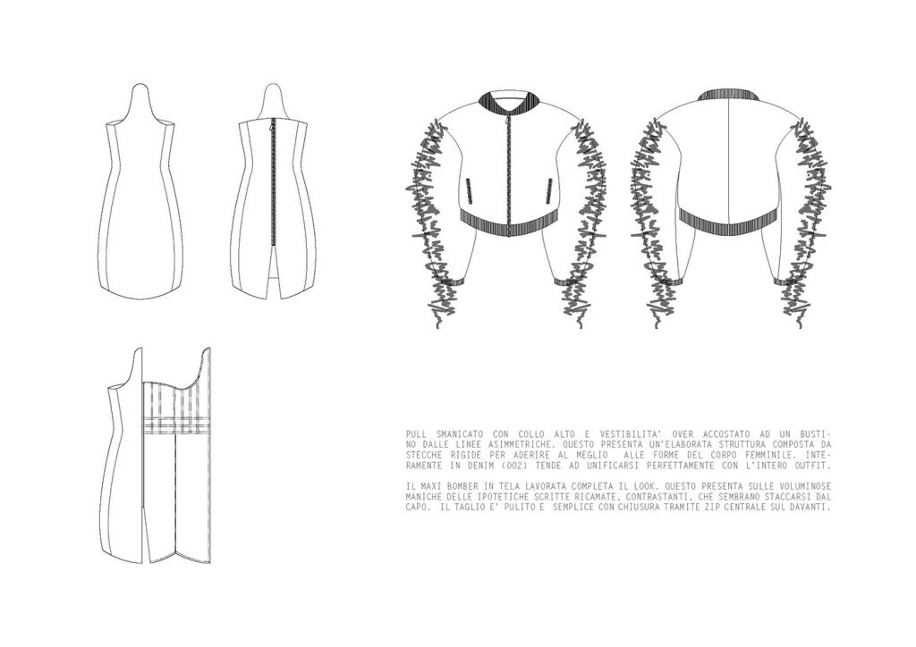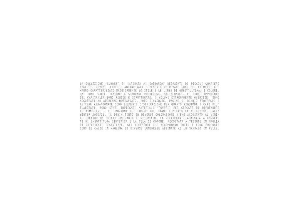 LA COLLEZIONE “SUBURB” E’ ISPIRATA AI SOBBORGHI DEGRADATI DI PICCOLI QUARTIERI INGLESI. ROVINE, EDIFICI ABBANDONATI E MEMORIE RITROVATE SONO GLI ELEMENTI CHE HANNO CARATTERIZZATO MAGGIORMENTE LO STILE E LE LINEE DI QUEST’ULTIMA. I COLORI, DAI TONI SCURI, TENDONO A SEMBRARE POLVEROSI, MALINCONICI. LE FORME IMPONENTI DEI CAPISPALLA SONO RIGIDE E STRUTTURATE, I VOLUMI ESTREMAMENTE OVERSIZE SONO ACCOSTATI AD ADERENZE MOZZAFIATO. FOTO RINVENUTE, PAGINE DI DIARIO STRAPPATE E LETTERE ABBANDONATE SONO ELEMENTI D’SIPIRAZIONE PER QUANTO RIGUARDA I CAPI PIU’ ELABORATI. SONO STATI IMPIEGATI MATERIALI “POVERI” PER CERCARE DI RIPRENDERE LE ATMOSFERE E LE EMOZIONI DEI LUOGHI CHE HANNO ISPIRATO LA COLLEZIONE FALL/WINTER 2020/21. IL DENIM TINTO IN DIVERSE COLORAZIONI VIENE ACCOSTATO AL VINILE CREANDO UN OUTFIT ORIGINALE E RICERCATO. LA PELLICCIA E’ABBINATA A CORSETTI DI IMBOTTITURA SINTETICA E LA TELA DI COTONE ACCOSTATA A TESSUTI IN MAGLIA DI DIFFERENTI PESANTEZZE. GLI ACCESSORI CHE ACCOMUNANO TUTTI I LOOK PROPOSTI SONO LE CALZE IN MAGLINA DI DIVERSE LUNGHEZZE ABBINATE AD UN SANDALO IN PELLE.